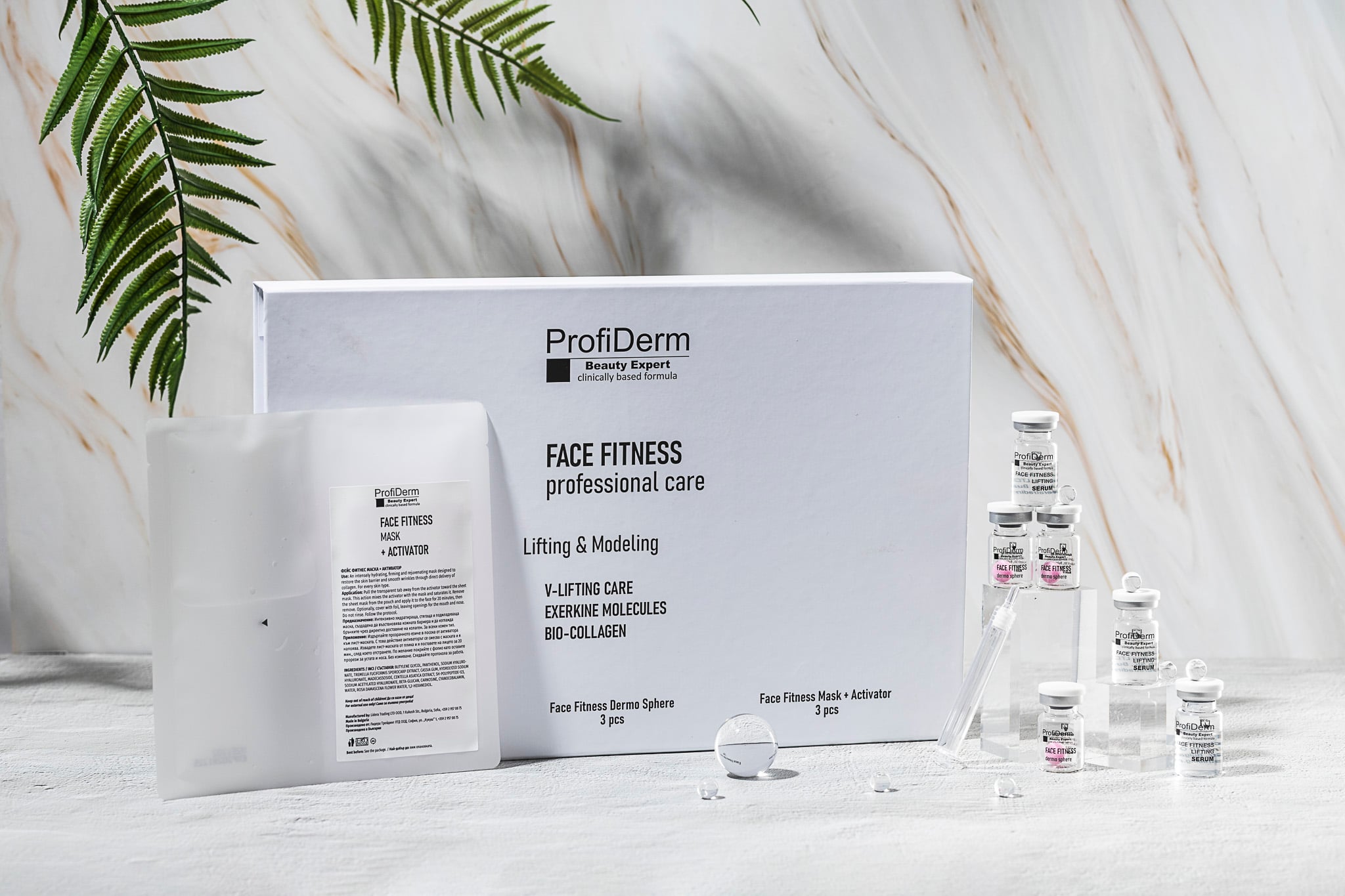 4. Lisage kogu Face Fitness seerumi ampulli sisu Face Fitness Dermo Sphere ampullile ja loksutage tugevalt, kuni sfäär on täielikult lahustunud. Kandke pool sisust aplikaatori või õhukese pintsli abil näole, kaelale ja dekolteele.